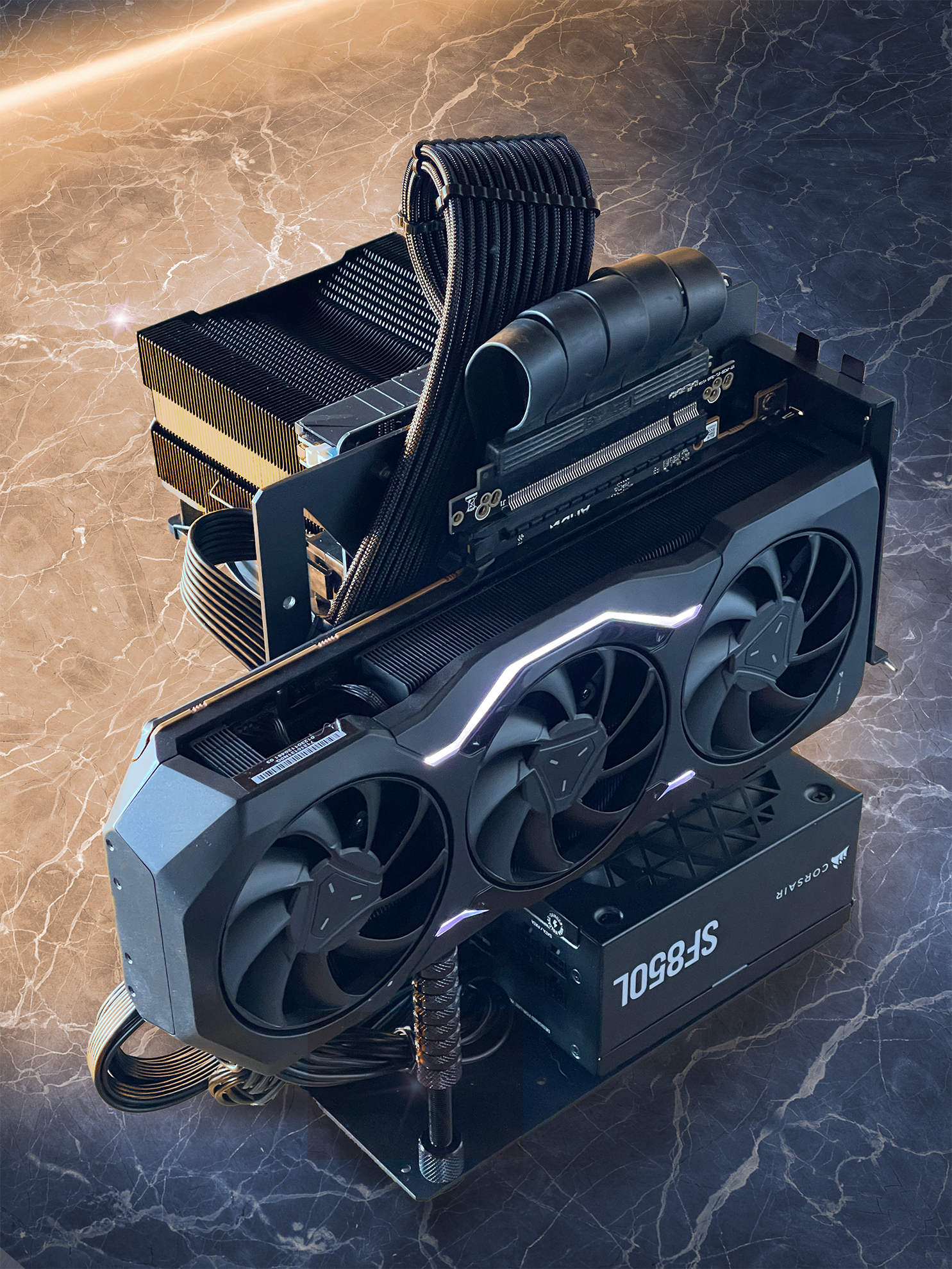 Initial attempts to boot with a 7900 XTX GPU were unsuccessful. Swapping in an older 2695-v3 14-core Xeon was necessary to boot and flash the BIOS, enabling support for the 6900K. Confronted with cooling fan issues due to the rare socket type, I created a custom bracket from electrical plate scraps, tackling the problem head-on. The necessity to modify the case for the Corsair SF850L SFX PSU for better cooling led me to plan cutting out a section of the case. Adapting to PSU sizing and cable length issues, I pulled an extension cable from my old AMD and reconfigured it for the new setup. The limitation of only two RAM slots meant selecting sticks with the best timings from my previous 80GB setup.